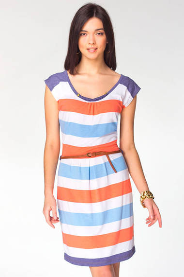 ОписаниеЛегкое летнее платье из вискозной ткани с принтом в широкие полосы. Модель прямого кроя, без рукавов, с коричневым ремешком в комплекте.
