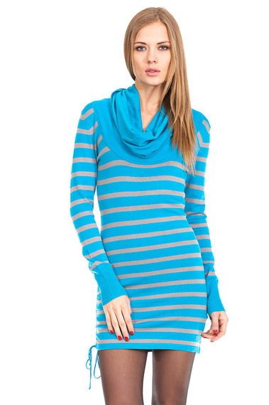 Платье-туника из бирюзового трикотажного полотна в полоску. Модель с длинными рукавами и воротом "хомут", на правом бедре есть кулиска, позволяющая регулировать длину туники.