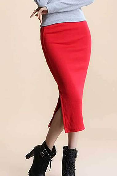Модная юбка-чулок ярко красного цвета, вполнена из плотного трикотажного полотна "лапша". По бокам имеет небольшие разрезы.